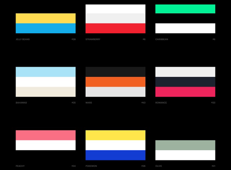 開啟 Colorinspire.io 網(wǎng)站后可以看到各個(gè)顏色組合,目前約有45 種,每一個(gè)組合都由三種顏色構(gòu)成,下方還會(huì)有配色名稱和編號(hào)。