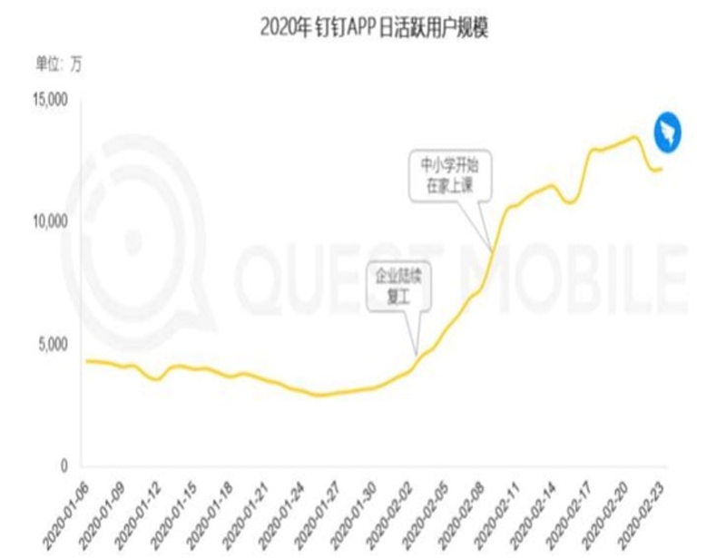 Trustdata 數據顯示:2020 年1月1日至2月21日,釘釘日活躍用戶從 2610萬升至1.5億,無疑成為這次疫情中單個產品增長最讓人印象深刻的產品。