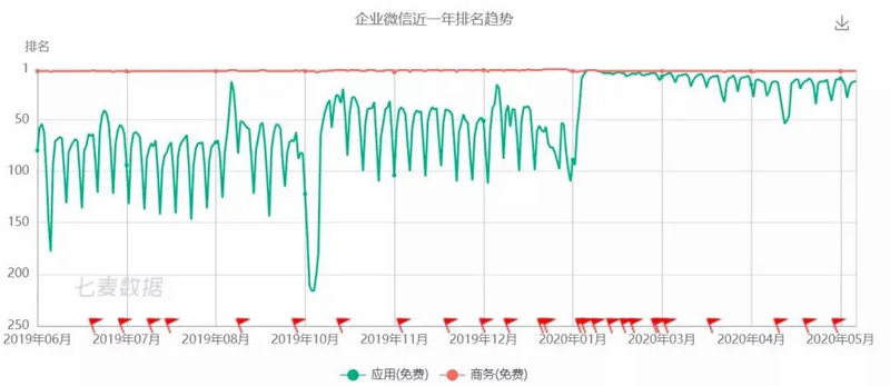 根據七麥數據的排名,我們看到企業(yè)微信在AppStore的排名從疫情之前的100名左右迅速上升到第1名、第2名,并且維持這個排名長達幾個月;