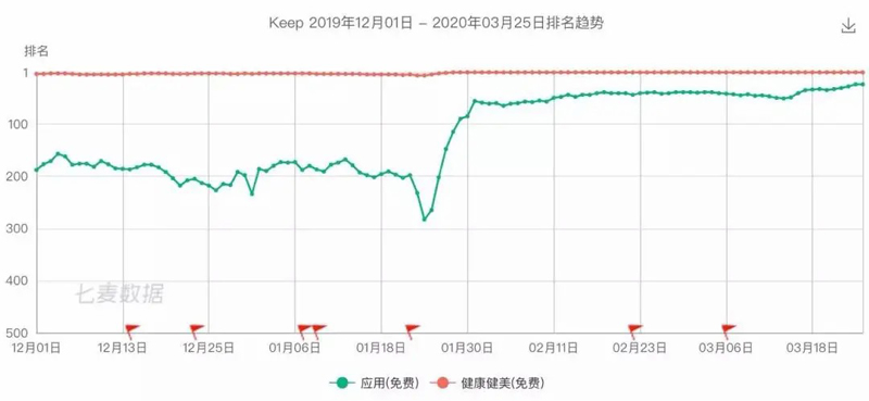 我們可以看到Keep在疫情之前在App Store的排名一直徘徊在200名附近,疫情之后顯著上升,一直維持在較高的排名。